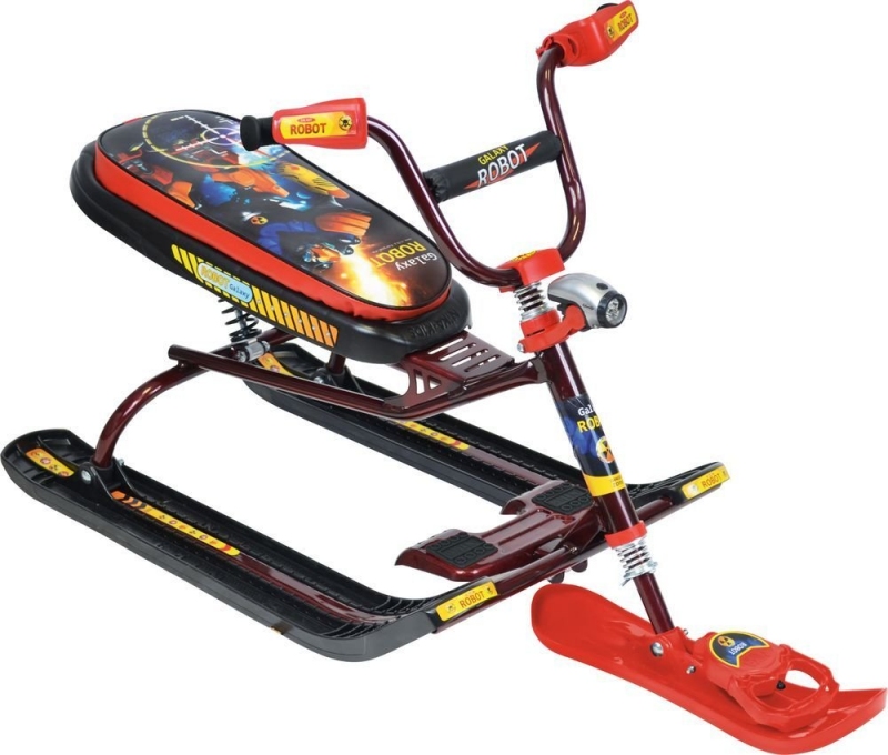 Снегокат с системой амортизации предназначен для детей в возрасте от 4 до 12 лет. Имеет сварную конструкцию из стальных труб. Лыжи снегоката изготовлены из морозостойкой пластмассы. Сиденье мягкое, обтянутое искусственной кожей с рисунком. На передней лыже-буксировочный трос-рулетка. Фонарик на каркасе позволяет освещать дорогу в темное время суток.