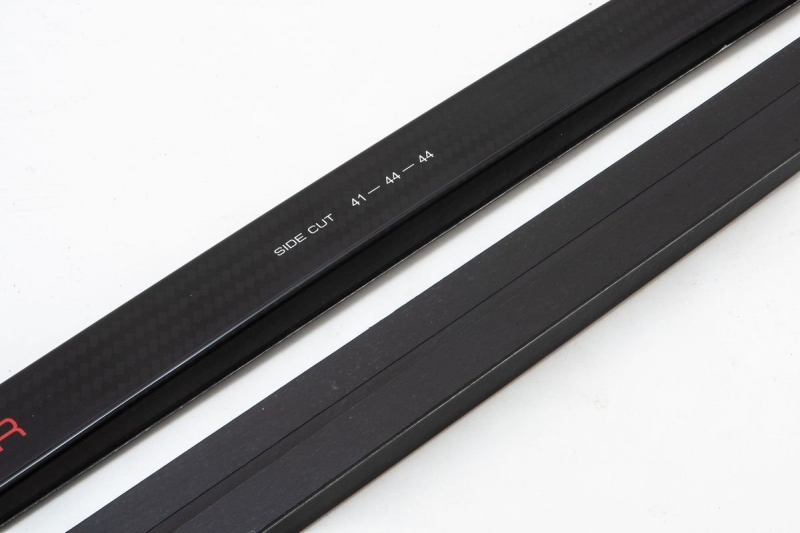 На скользящей поверхности расположен один желоб шириной 5-6 мм и глубиной 0.6 мм, проходящий через продольную ось лыжи, который помогает сохранять направление движения и делает лыжи более устойчивыми.