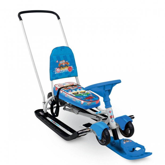 Снегокат с механизмом выдвижных шасси и родительской ручкой-толкателем для прогулок с детьми от 4 до 7 лет. Модель 2 в 1: колеса и полозья позволяют свободно передвигать снегокат по любой дороге.