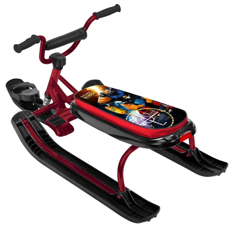 Снегокат предназначен для перевозки детей от 4 до 12 лет по плотному снегу или льду, катанию с горок. Имеет сварную конструкцию из стальных труб, лыжи из морозоустойчивой пластмассы и мягкое сиденье, обтянутое искусственной кожей с рисунком. Удобный велоруль позволяет легко маневрировать. Между ручками предусмотрена защитная накладка. Ножной усиленный тормоз позволит контролировать скорость при спуске с горы. Буксировочный трос с автоматической намоткой. Комплект наклеек на снегокат в подарок!