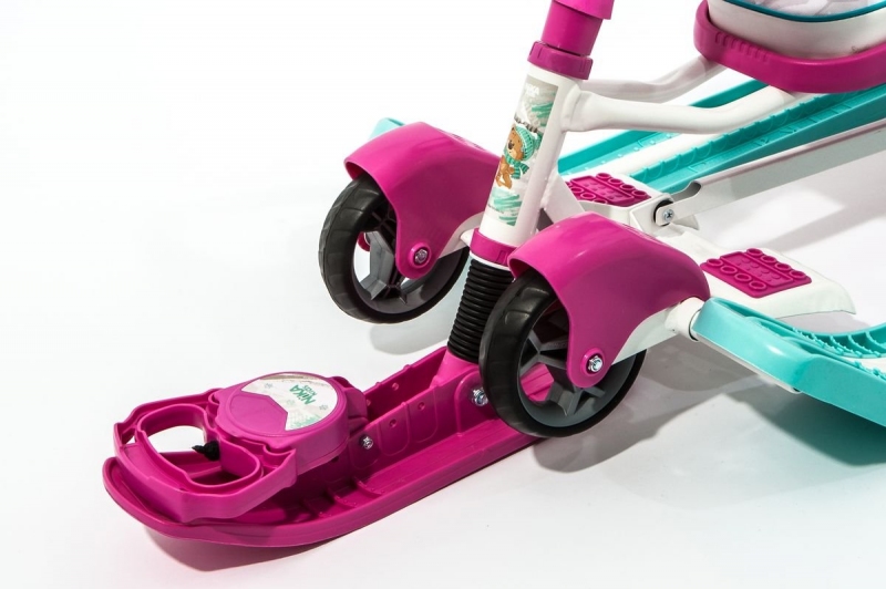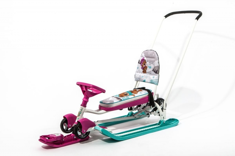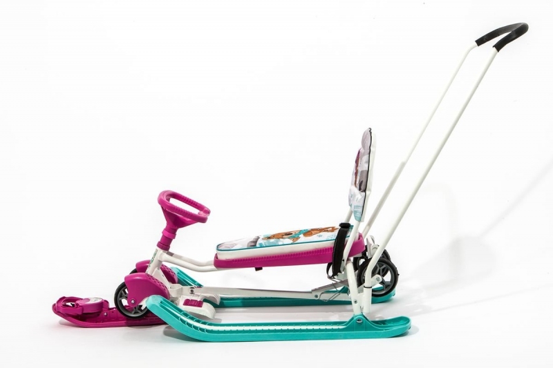 Снегокат с механизмом выдвижных шасси и родительской ручкой-толкателем для прогулок с детьми от 4 до 7 лет. Модель 2 в 1: колеса и полозья позволяют свободно передвигать снегокат по любой дороге.