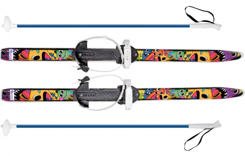 пластиковые лыжи с металлическими креплениями, стеклопластиковые палки с ручками и травмобезопасными наконечниками